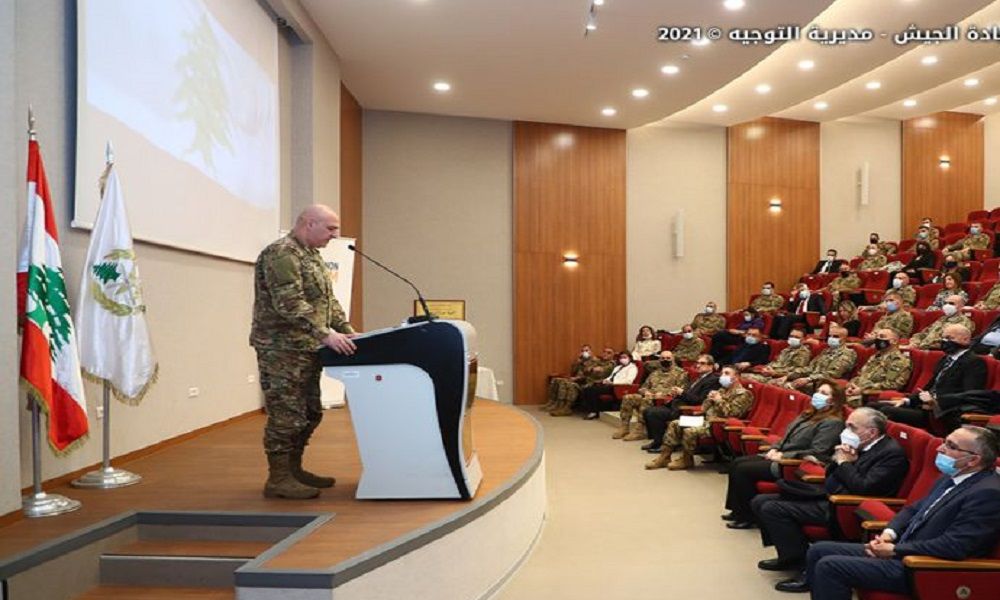 وتابع قائد الجيش: “إن ما نسمعه من تنويه بأدائها تجاه مختلف القضايا والاستحقاقات، هو تـأكيد على صوابية الخيارات والقرارات التي تتّخذها، والتي تحمّلها مسؤوليات إضافية باعتبارها العمود الفقري للبنان والضامن للسلم الأهلي والاستقرار. في ظل الظروف الراهنة وبخاصة الأزمة الاقتصادية التي يعاني منها وطننا، فإن الفساد قد يجد له سبيلاً، إلا أن المؤسسة تقوم بإجراءات دقيقة حالياً لمراقبة عناصرها وتوعيتهم من مخاطر الانحراف، وهي تعمل على تعزيز صمودهم من خلال وقوف ضباطهم إلى جانبهم، وتوفير المساعدات الأساسية التي تسمح لهم بالصمود لاجتياز هذه المرحلة. إن وحدة المؤسسة العسكرية وصمودها في مواجهة التحديات والاستحقاقات المفصلية، أمر أساسي في هذه المرحلة الدقيقة من تاريخ لبنان”.
