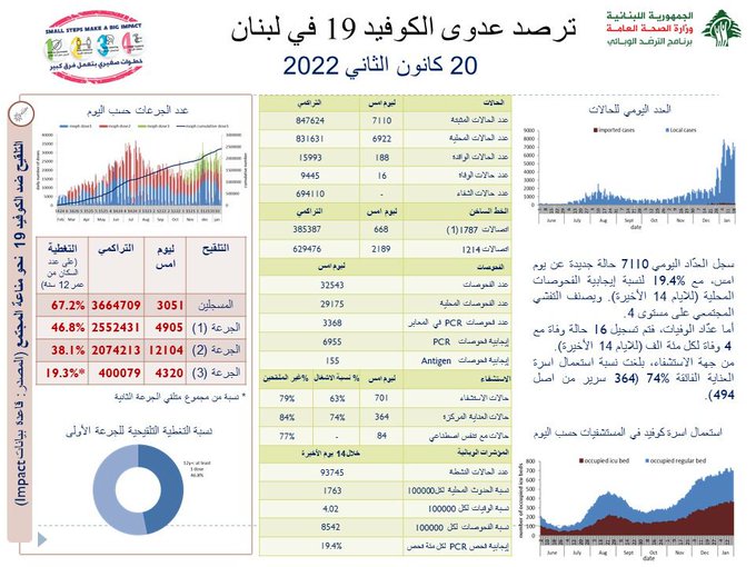 16 وفاة جديدة بكورونا… ماذا عن الإصابات؟ أعلنت وزارة الصحة العامة في تقريرها اليومي تسجيل 7110 إصابات جديدة بفيروس كورونا، رفعت العدد التراكمي للحالات المثبتة الى 847624، كما تم تسجيل 16 حالة وفاة. اشترك فى النشرة البريدية لتحصل على اهم الاخبار بمجرد نشرها تابعنا على مواقع التواصل الاجتماعى