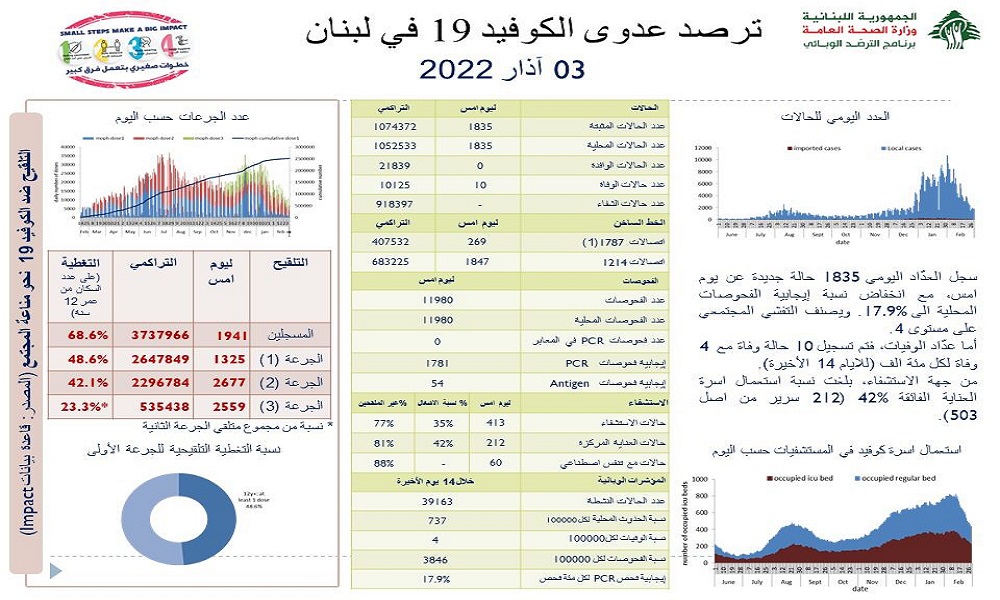 أعلنت وزارة الصحة العامة في تقريرها اليومي تسجيل 1835 إصابة جديدة بفيروس كورونا رفعت العدد التراكمي للحالات المثبتة الى 1074372، كما تم تسجيل 10 حالات وفاة. اشترك فى النشرة البريدية لتحصل على اهم الاخبار بمجرد نشرها تابعنا على مواقع التواصل الاجتماعى