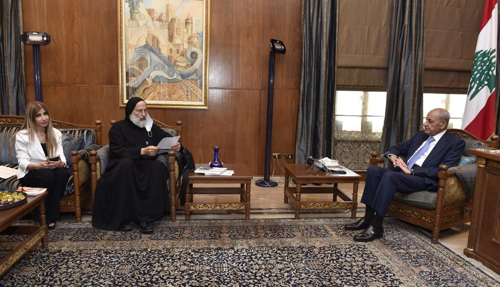 والتقى بري الأب ميخائيل روحانا الأنطوني ترافقه الإعلامية ليا عادل معماري الاب روحانا قدم لرئيس المجلس كتابه الجديد “الجمهورية الخامسة الحل للمعضلة اللبنانية ” كما قدمت الإعلامية ليا معماري كتابها “تراب الغربة” .