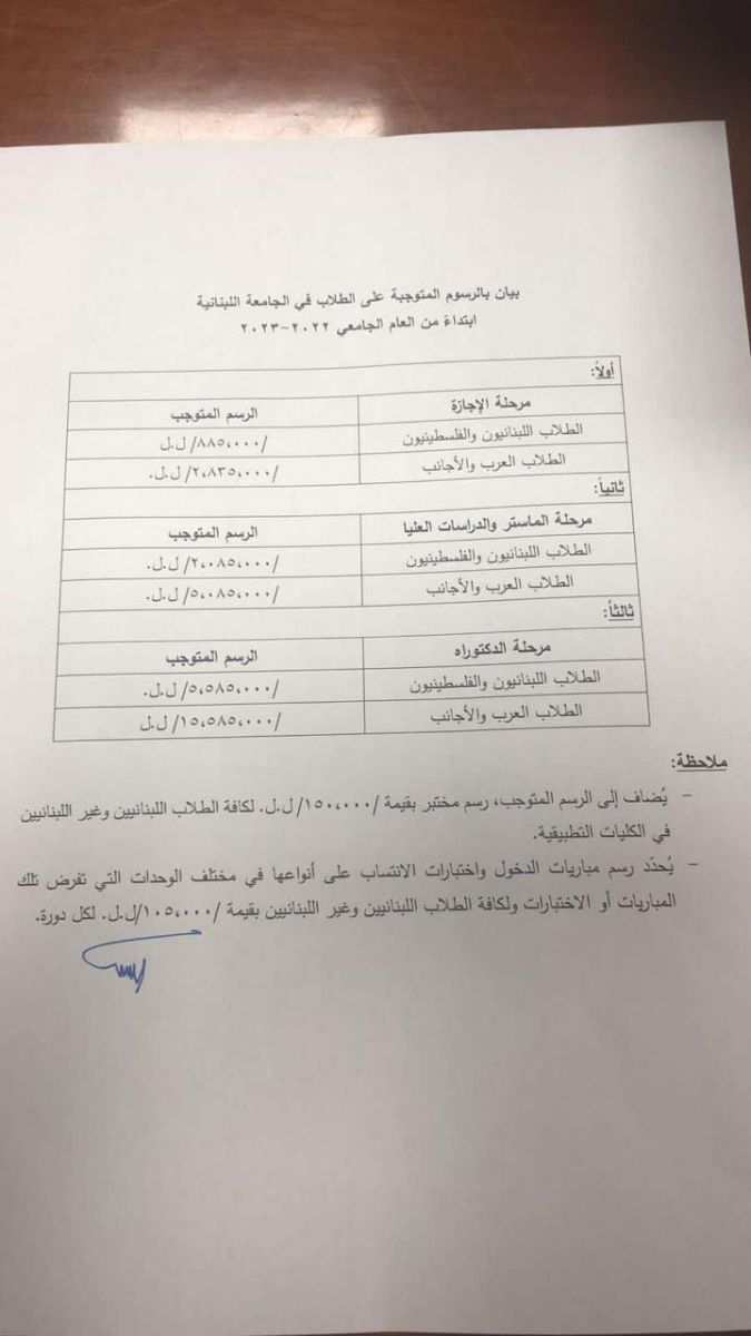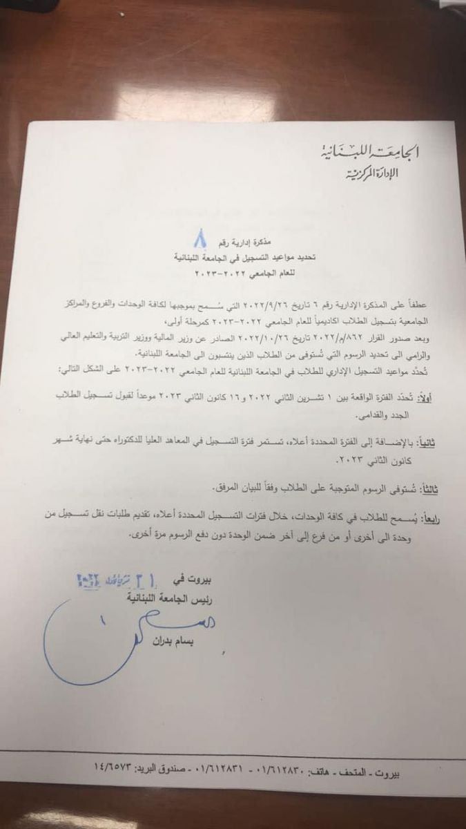أصدرت الإدارة المركزية في الجامعة اللبنانية مذكرة حدّدت بموجبها مواعيد التسجيل، ولأوّل مرّة منذ سنوات عديدة، رفعت الرسوم المتوجبة على الطلاب خلال العام الجامعي 2022-2023, وفق الآتي: اشترك فى النشرة البريدية لتحصل على اهم الاخبار بمجرد نشرها تابعنا على مواقع التواصل الاجتماعى