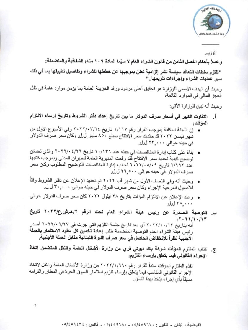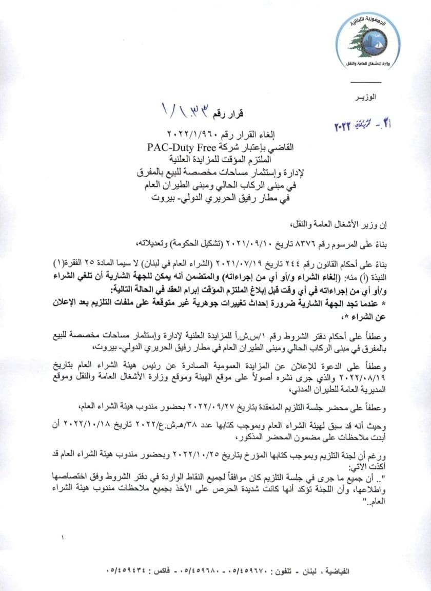 أعلن وزارة الاشغال العامة والنقل في حكومة تصريف الاعمال علي حمية، اليوم الأربعاء، “وفقاً للمادة 25 من قانون الشراء العام، إلغاء نتيجة المزايدة العلنية لاستثمار السوق الحرة في المطار، وبدء الإجراءات للإعلان عن مزايدة جديدة على أن يكون سعر الافتتاح بالدولار الأميركي، ذلك تأميناً لرفد الخزينة العامة بأعلى قدر ممكن من الموارد المالية.”