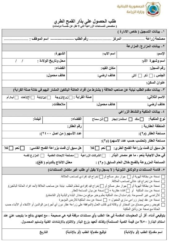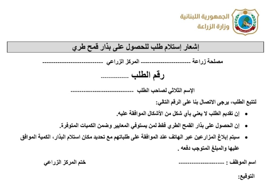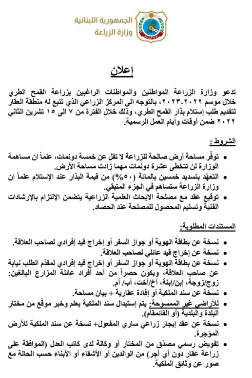 أوضحت وزارة الزراعة، أنه “بعد إطلاق الخطة الوطنية لزراعة القمح في لبنان والتي تمت برعاية رئيس حكومة تصريف الأعمال نجيب ميقاتي ممثلاً بوزير الزراعة في حكومة تصريف الأعمال عباس الحاج حسن، يسر وزارة الزراعة أن تعمم على المزارعين الكرام نسخة عن المستندات المطلوبة للحصول على بذور القمح الطري الصالح لصناعة الخبز، بالإضافة إلى صورة عن الطلب الذي يجب تقديمه في مراكز الوزارة، بالإضافة الى نموذج إشعار استلام طلب للحصول على بذور قمح طري”.