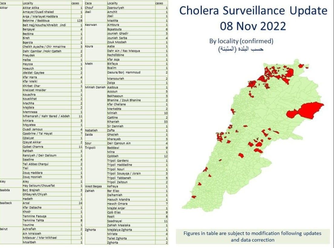 كما نشرت الوزارة جدولاً يظهر كيف توزعت الإصابات حسب المناطق والأقضية اللبنانية.