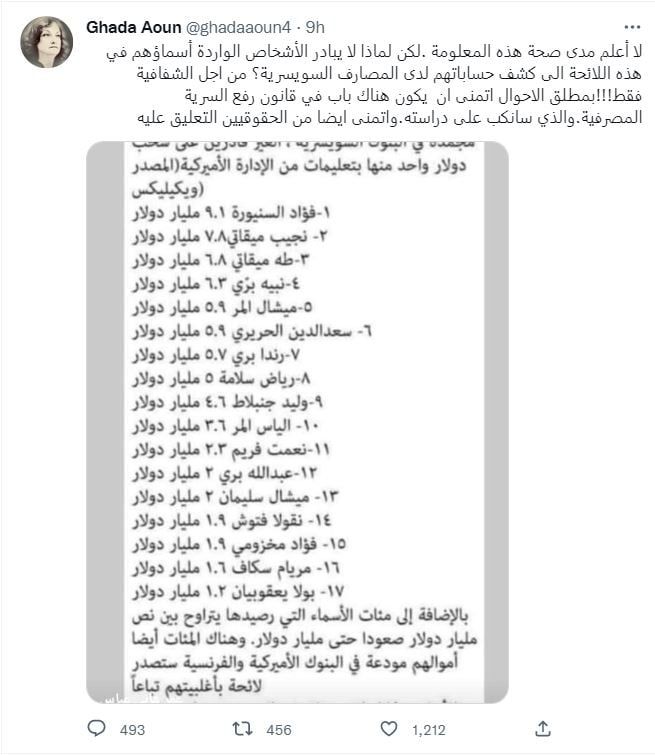 وأشارت القاضية عون، عبر تويتر، إلى أنني “لا أعلم مدى صحة هذه المعلومة، لكن لماذا لا يبادر الأشخاص الواردة أسماؤهم في هذه اللائحة إلى الكشف عن حساباتهم لدى المصارف السويسرية؟ من أجل الشفافية فقط”.