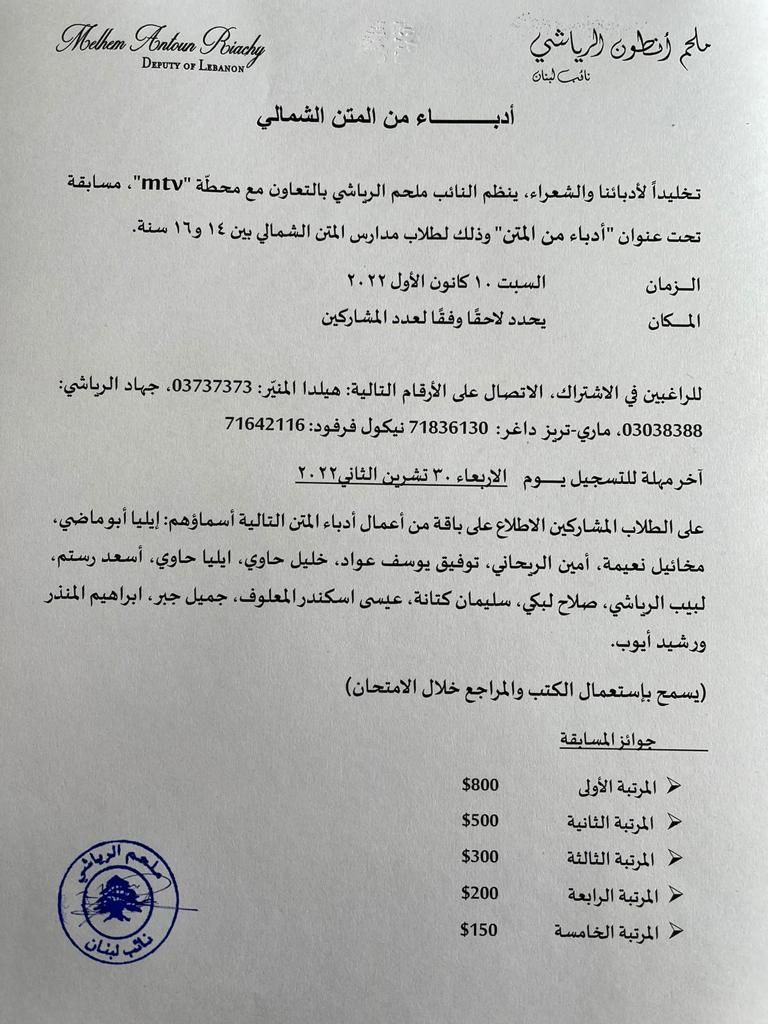 تخليدًا لأدباءنا والشعراء، ينظم عضو تكتل الجمهورية القوية النائب ملحم الرياشي، بالتعاون مع محطة “mtv”، مسابقة تحت عنوان “أدباء من المتن” وذلك لطلاب مدارس المتن الشمالي بين 14 و16 سنة.