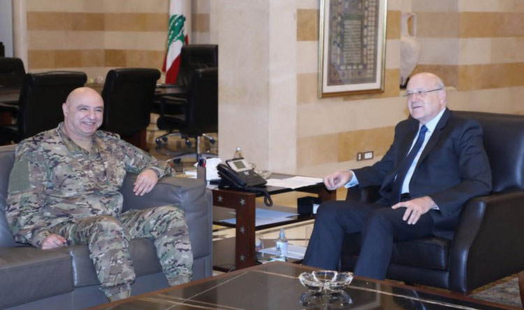 التقى رئيس حكومة تصريف الأعمال نجيب ميقاتي قائد الجيش العماد جوزف عون بعد ظهر اليوم الأربعاء، في السراي الحكومي وعرض معه الوضع الأمني في البلاد.