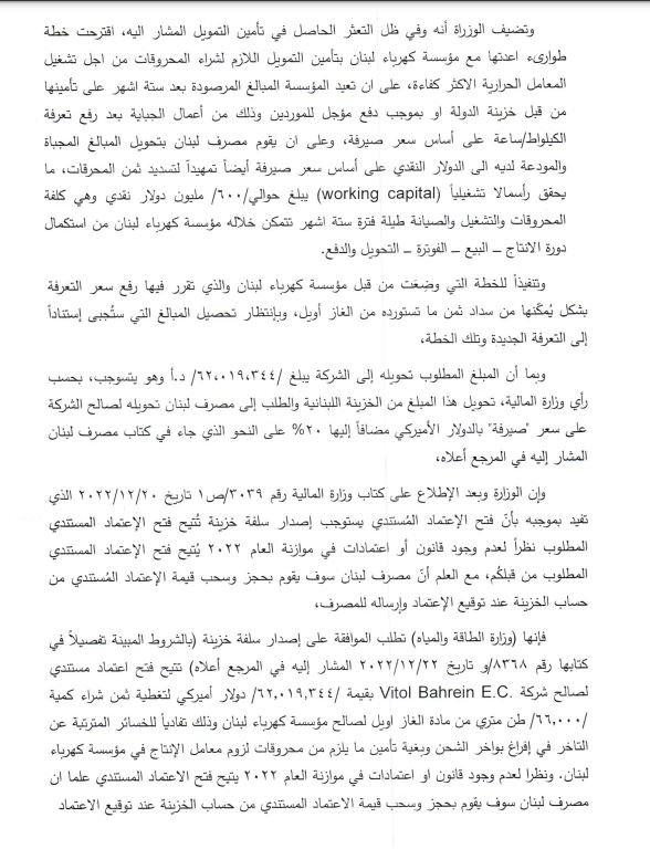 الثانية: وجوب التقيد المطلق بتنفيذ بنود الخطة الموضوعة من قبل مؤسسة كهرباء لبنان، اي الايضاح رسميا من قبل المؤسسة كيفية اعادة هذه السلفة للخزينة، حتى لا تلحق بكل السلف السابقة.”