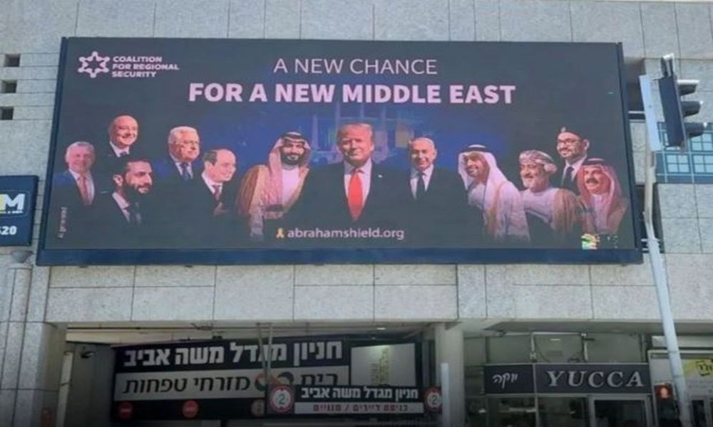وحملت اللوحة شعار: “فرصة جديدة لشرق أوسط جديد”، وتبيّن أنها جزء من حملة أطلقها “التحالف من أجل الأمن الإقليمي” في إسرائيل، وتهدف للترويج لتحالف ضد إيران ووكلائها.