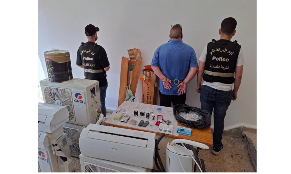 بتفتيش منزله ومتجره في محلة تلة الخياط، تم ضبط /662/ حبة كبتاغون، كمية من مادتي الكوكايين وحشيشة الكيف، ميزان حساس، عدد كبير من العلب البلاستيكية، /4/ مكيّفات”.