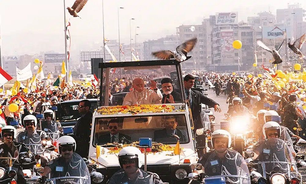 أمّا الزيارة الثانية في أيار 1997، فحُفرت عميقًا في الذاكرة الجماعية. جاء البابا يوحنا بولس الثاني إلى لبنان تحت سطوة النظام الأمني السوري، والمسيحيون يشعرون أنهم تُركوا وحدهم. واكبته تظاهرة كبيرة حينها اعتبرت الأكبر في تاريخ لبنان وهتف له الألوف: “حرية! سلام!” رفع الشباب شارات سودًا في حريصا ليقولوا للبابا إن أصواتهم تُقمع وإن شعار “حرية، سيادة، استقلال” كان يُواجَه بالاعتقال. نظر إليهم البابا بنظرة احتضان، وخرج عن النصّ قائلًا: “يا شباب لبنان، لا تقيموا حواجز جديدة… اهدموا جدران الخوف، كل شيء يتغيّر فللشدّة وقت… ويأتي زمن الانتصار!” ثم سلّم الإرشاد الرسولي “رجاء جديد للبنان”، الذي وضع تصورًا لوطن يقوم على الشراكة ودور المواطنين، وعلى علاقة سليمة بين السياسة والكنيسة في خدمة الخير العام.