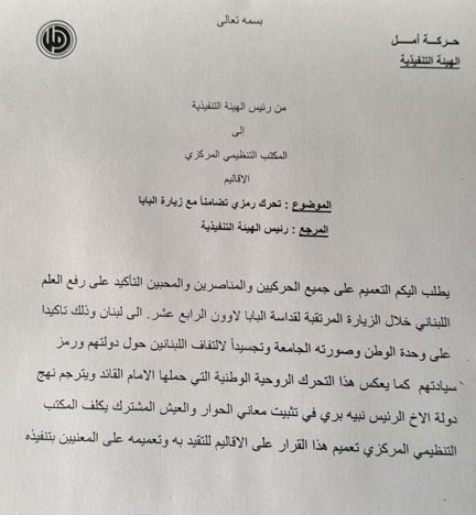 أصدرت حركة أمل، تعميماً داخلياً، تتوجه من خلاله لجميع الحركيين والمناصرين، تأكيداً على رفع العلم اللبناني خلال الزيارة المرتقبة لقداسة البابا لاوون الرابع عشر إلى لبنان. اشترك فى النشرة البريدية لتحصل على اهم الاخبار بمجرد نشرها تابعنا على مواقع التواصل الاجتماعى