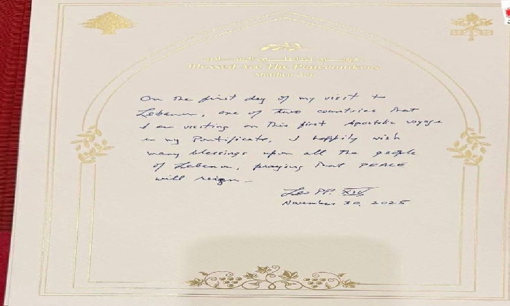 ترك البابا لاوون الرابع عشر، الأحد، رسالة في السجل الذهبي بالقصر الرئاسي في لبنان، عبّر فيها عن فرح زيارته الأولى إلى البلاد ضمن رحلته الرسولية. وجاء في الرسالة: