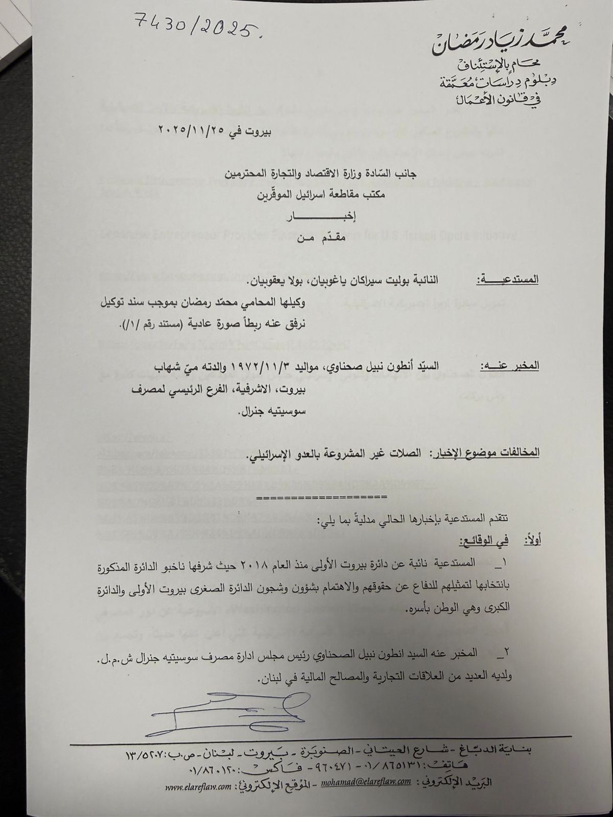 تقدمت النائب بولا يعقوبيان بواسطة وكيلها المحامي محمد رمضان بدعوى قضائية لدى وزارة الاقتصاد والتجارة- مكتب مقاطعة اسرائيل، ضد رئيس مجلس ادارة مصرف ال SGBL السيد انطون الصحناوي ، بجرم الصلات غير المشروعة بالعدو الاسرائيلي.