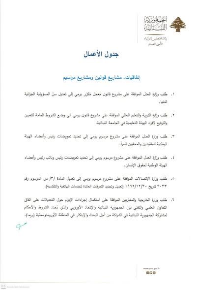 يعقد مجلس الوزراء جلسة عند الساعة الثالثة من بعد ظهر يوم الجمعة الواقع فيه 2026/2/6 في السراي الكبير لبحث المواضيع المبينة في جدول الأعمال المرفق. اشترك فى النشرة البريدية لتحصل على اهم الاخبار بمجرد نشرها تابعنا على مواقع التواصل الاجتماعى