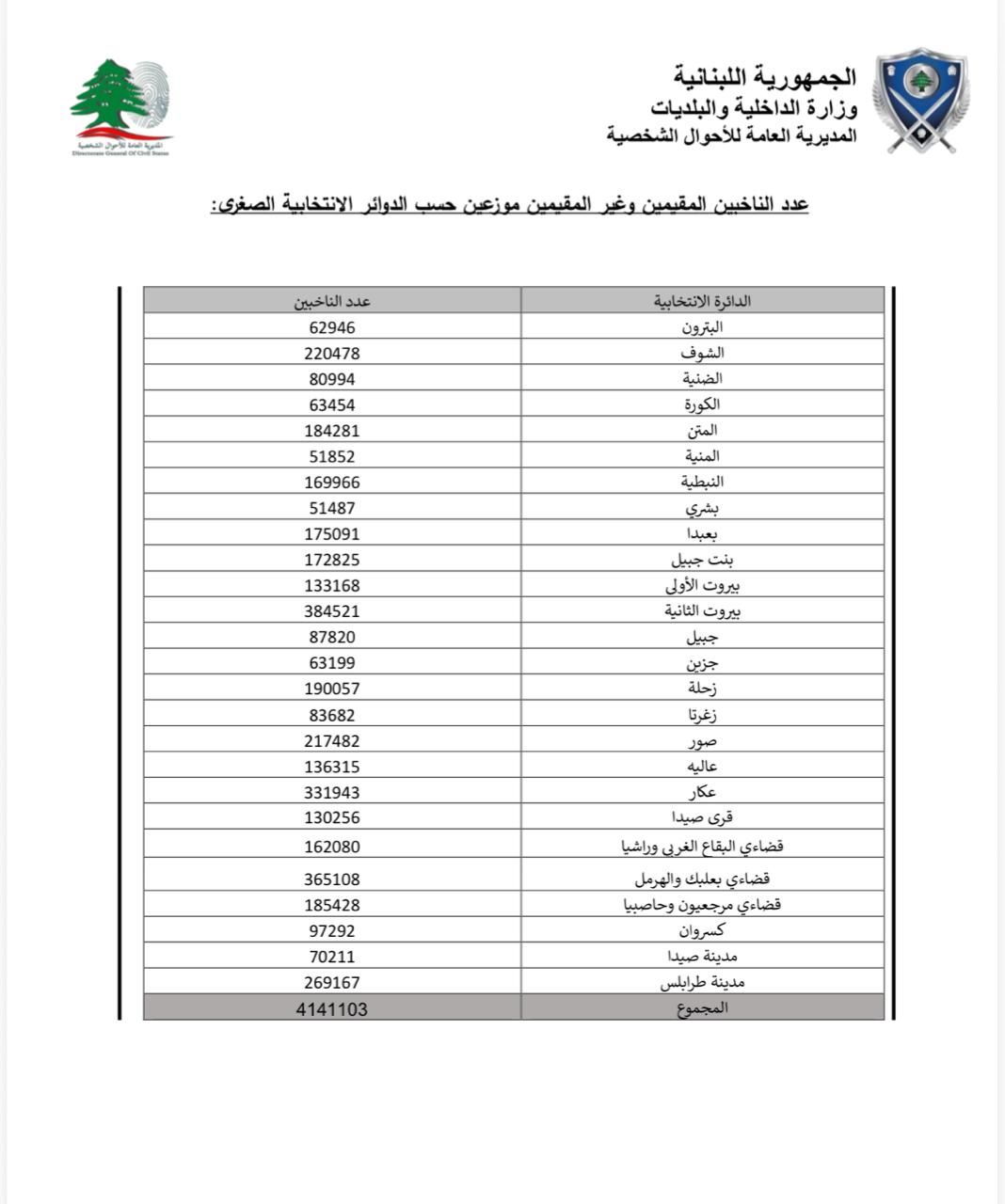 – أعداد الناخبين المقيمين وغير المقيمين وتوزيعهم بحسب الدوائر الانتخابية الصغرى.