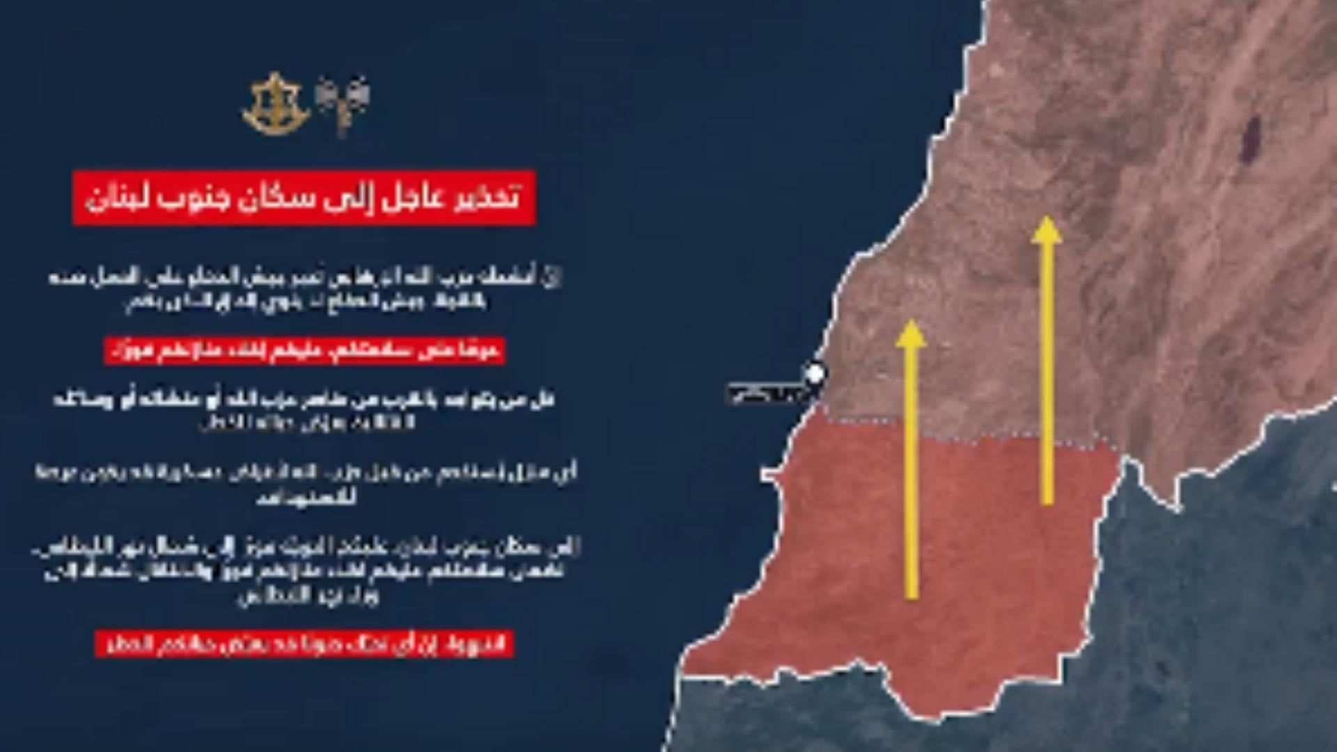 أصدر الجيش الإسرائيلي إنذاراً عاجلاً إلى سكان جنوب لبنان المتواجدين جنوب نهر الليطاني.