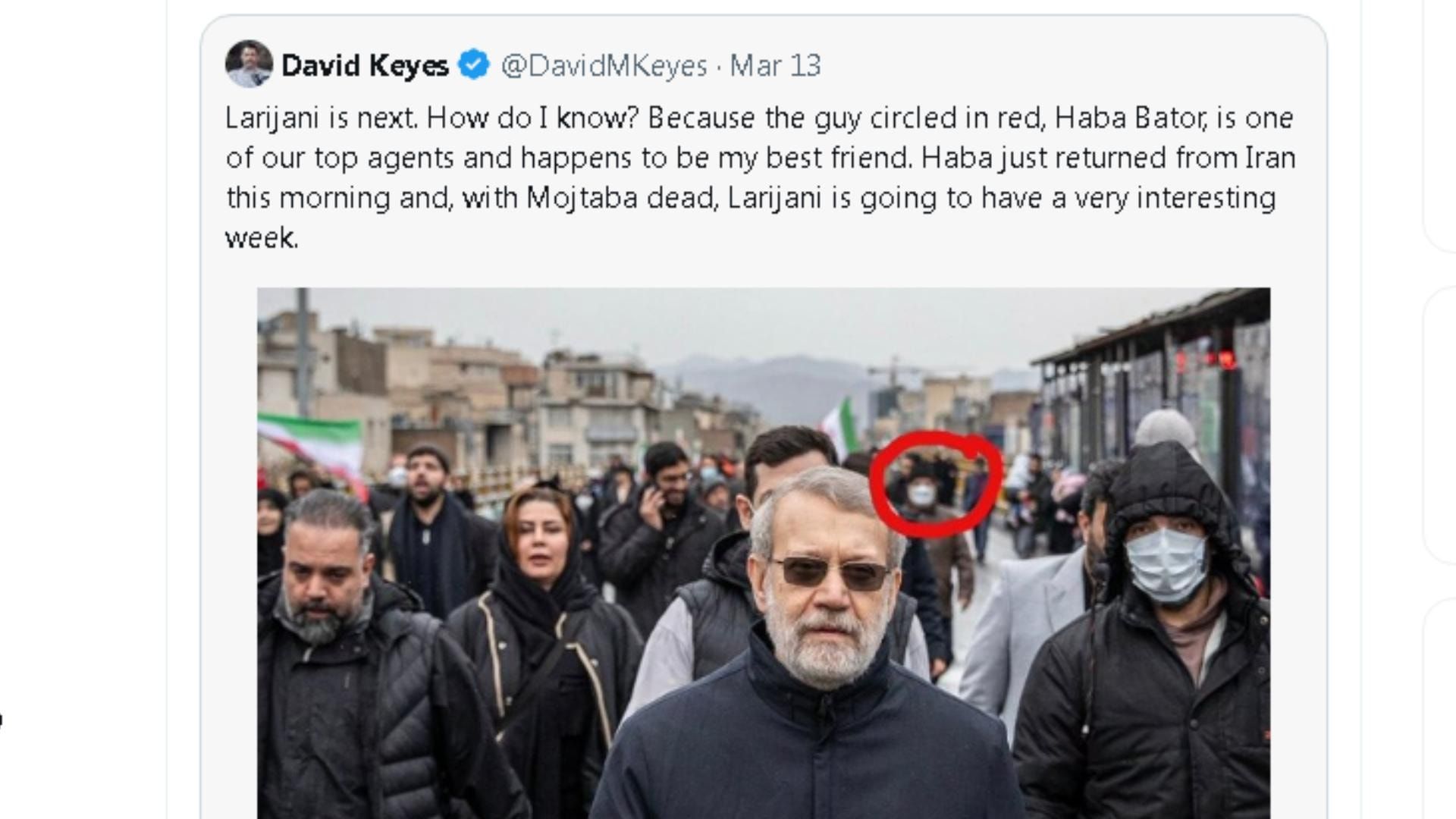 وكان كيز قد نشر صورة تظهر لاريجاني أثناء تحركه برفقة عدد من مرافقيه، مشيراً إلى شخص يظهر خلفه على بعد أمتار قليلة، وادعى في تغريدته أن هذا الشخص “صديق له” ويعمل كعميل لصالحهم، مرفقاً اسماً قال إنه “هالا باتور”.