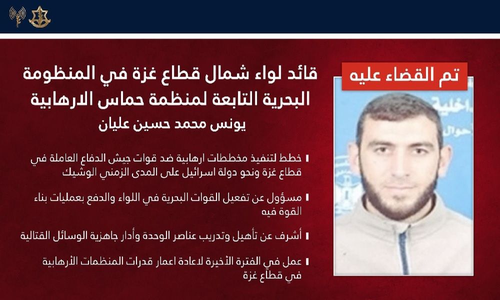أعلن الجيش الإسرائيلي، بالتعاون مع جهاز الأمن العام (الشاباك)، تنفيذ عملية استهداف أدت إلى مقتل يونس محمد حسين عليان، قائد لواء شمال قطاع غزة في المنظومة البحرية التابعة لحركة حماس.