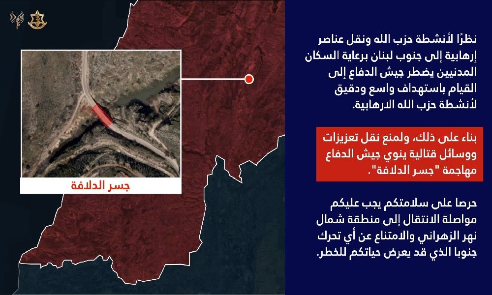 ودعا السكان إلى الانتقال شمال نهر الزهراني والامتناع عن التوجه جنوباً، محذراً من أن أي تحرك في تلك المنطقة قد يعرض حياتهم للخطر، في ظل تصاعد التوترات العسكرية على الجبهة الجنوبية.