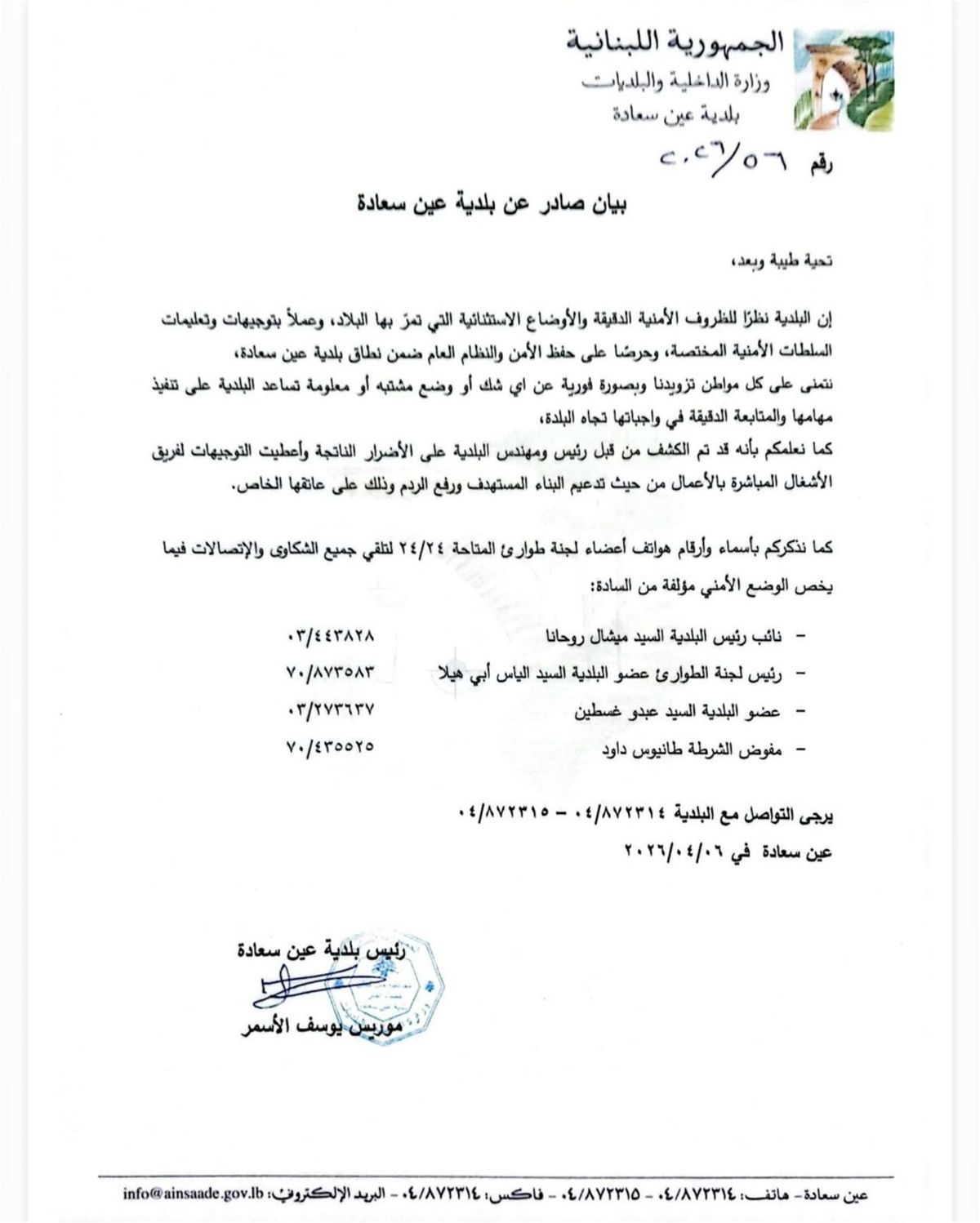 أصدرت بلدية عين سعادة اليوم الاثنين بيانا، قالت فيه: “نظرا للظروف الأمنية الدقيقة والأوضاع الاستثنائية التي تمر بها البلاد، وعملاً بتوجيهات وتعليمات السلطات الأمنية المختصة، وحرصا على حفظ الأمن والنظام العام ضمن نطاق بلدية عين سعادة، نتمنى على كل مواطن تزويدنا وبصورة فورية عن أي شك أو وضع مشتبه أو معلومة تساعد البلدية على تنفيذ مهامها والمتابعة الدقيقة في واجباتها تجاه البلدة”.