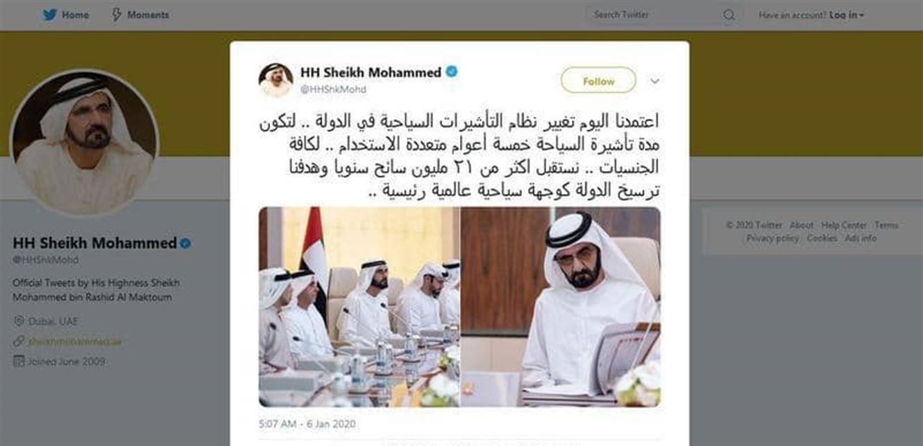 ويأتي ذلك تأكيداً على مكانة دولة الإمارات كوجهة سياحية عالمية للجميع، وفقاً لما ذكرت وكالة الأنباء الإماراتية "وام". وقال الشيخ محمد بن راشد في تغريدة نشرت على حسابه في تويتر: "اعتمدنا اليوم تغيير نظام التأشيرات السياحية في الدولة .. لتكون مدة تأشيرة السياحة خمسة أعوام متعددة الاستخدام .. لكافة الجنسيات".