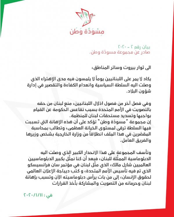 إن مجموعة ”مسودّة وطن“ تؤكد على أن هذه الإهانة التي تسببت فيها السلطة ترقى لمستوى الخيانة العظمى، وتطالب بمحاسبة المقصّرين في هذا الملف انطلاقاً من وزارة الخارجية بشخص وزيرها والفريق العامل.