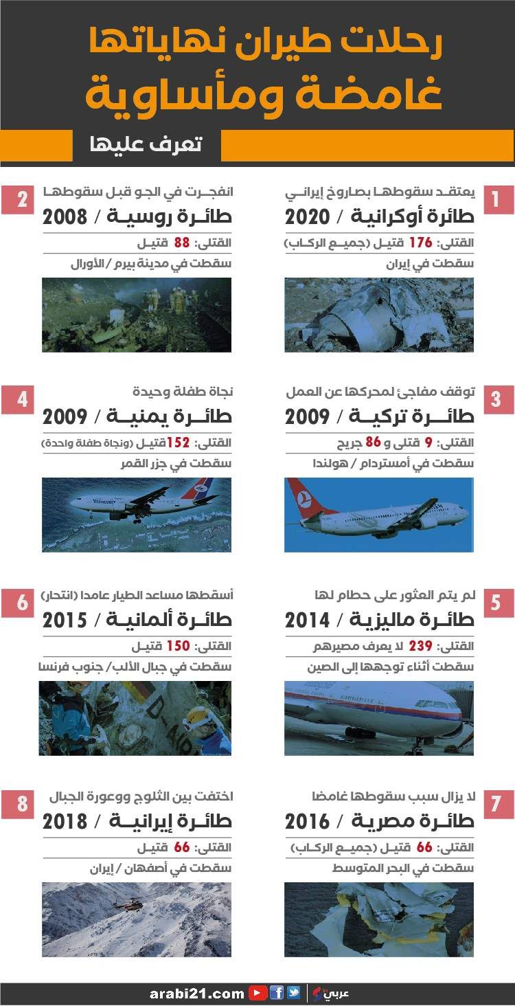 - كان آخر المآسي عام 2020 تحطّم طائرة الركاب الأوكرانية من طراز "بوينغ 737"، التي اعترفت إيران بإسقاطها بصاروخ عن طريق الخطأ.