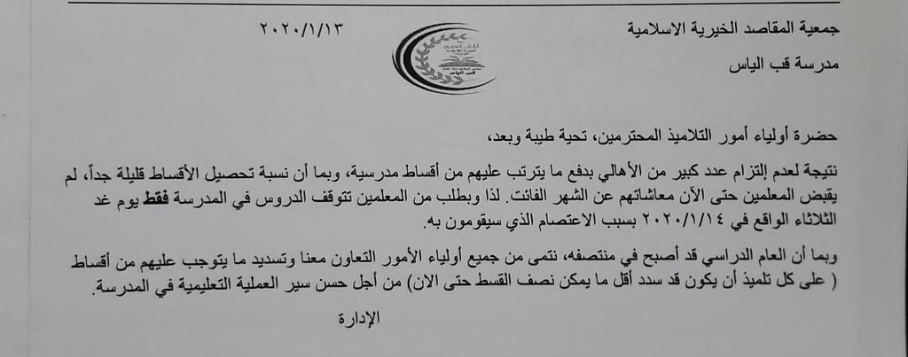 حصل "لبنان 24" على وثيقة صادرة عن "جمعية المقاصد الخيرية الإسلامية" - إدارة مدرسة قب الياس، وفيها أنّه "نتيجة لعدم التزام عدد كبير من الأهالي بدفع ما يترتب عليهم من أقساط مدرسية... وبالتالي لم يقبض المعلمون حتى الآن معاشاتهم عن الشهر الفائت، فإنّ الدروس في المدرسة تتوقف فقط يوم الثلاثاء بسبب الاعتصام الذي سيقومون به".