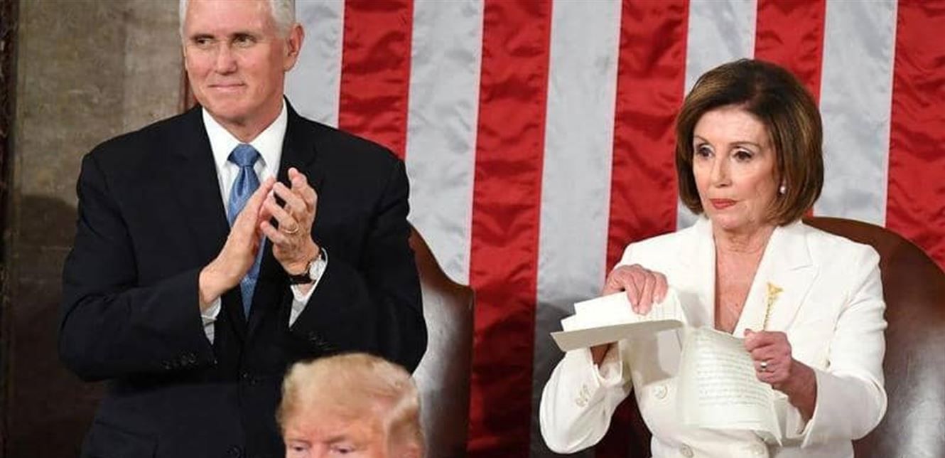 وعقب انتهاء ترامب من إلقاء كلمته، وخلال تصفيق الحضور، وقفت بيلوسي ومزقت نسخة الخطاب أمام الجميع. كما أصدرت عقب ذلك بياناً، قالت فيه إنّ "خطاب ترامب كان مليئاً بالمغالطات.. مرّة أخرى لم يكن الرئيس صادقاً". وتعد بيلوسي من أشد المعارضين لسياسات ترامب، وتعتبر الشخصية الرئيسية في ملف عزل ترامب، الأمر الذي خلق عداوة بين الإثنين.