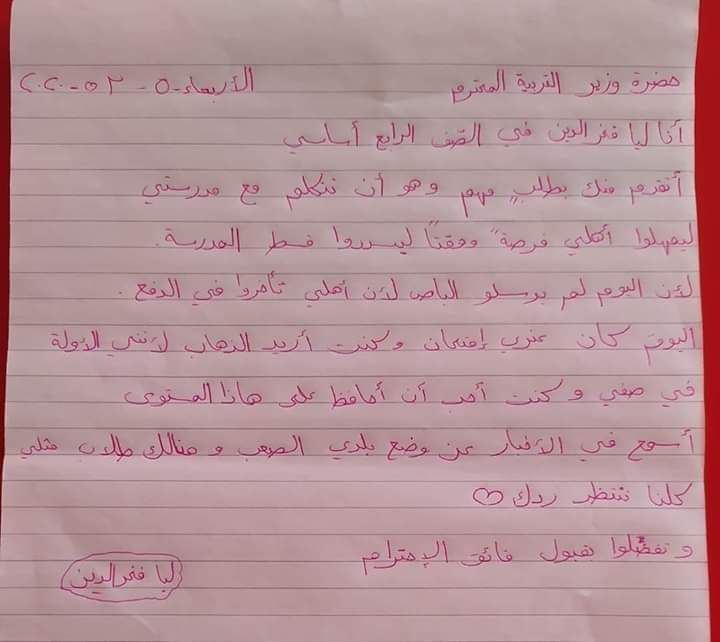 وجاء في الرسالة: "أنا ليا فخر الدين، في الصف الرابع أساسي.. أتقدّم منك بطلب مهم وهو أن تتكلم مع مدرستي ليمهلوا أهلي فرصة ليسددوا قسط المدرسة، لأن اليوم لم يرسلوا الباص، لأن أهلي تأخروا في الدفع".