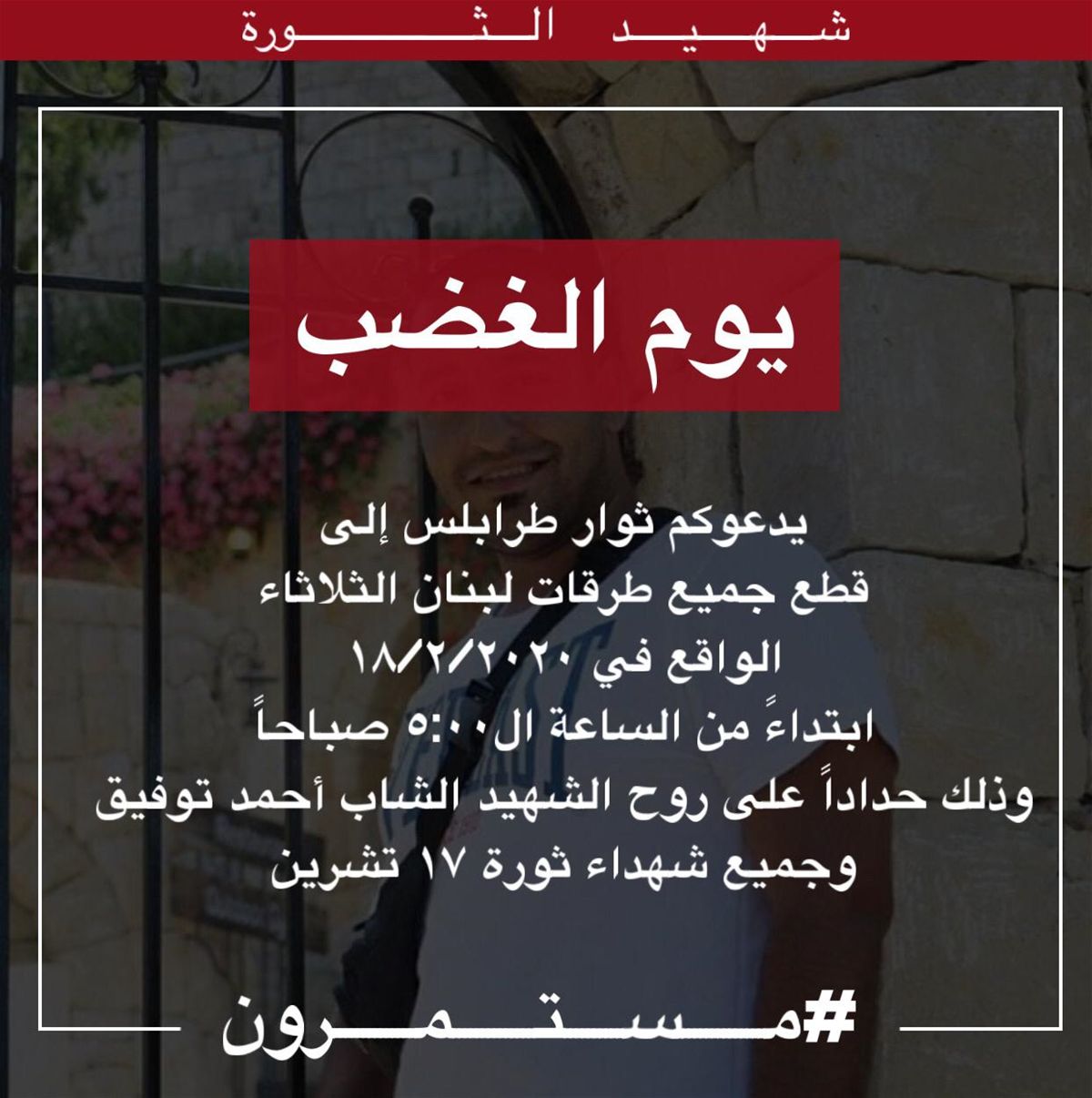 وانتشرت عبر مواقع التواصل الإجتماعي، دعوة للإضراب يوم غد الثلاثاء، تحت عنوان "يوم الغضب". ويدعو المنشور إلى قطع كل طرقات لبنان ابتداء من الساعة 5 صباحاً، وذلك حداداً على روح الشاب أحمد توفيق، وجميع شهداء ثورة 17 تشرين الأول.
