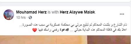وتعليقاً على الدعوى القضائية، قال زوج ملاك محمد حرز عبر حسابه على "فيسبوك": "نام الشارع وبلشت المحاكم، تم تبليغ مرتي بمحكمة عسكرية بسبب هذه الصورة. أهلا بك في قافلة المحاكم هذه البداية حياتي. دعوى رفعي راسك فيها".