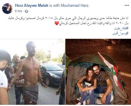 بدورها، كتبت ملاك في صفحتها على "فيسبوك": "انا مش خايفة طالما حدي وبضهري الرجال اللي حرق حالو بالـ2015، كرمال اصحابوا وكرمال هالبلد، بالـ2020 انا واثقة واكيدة انك رح تعمل المستحيل كرمالي".