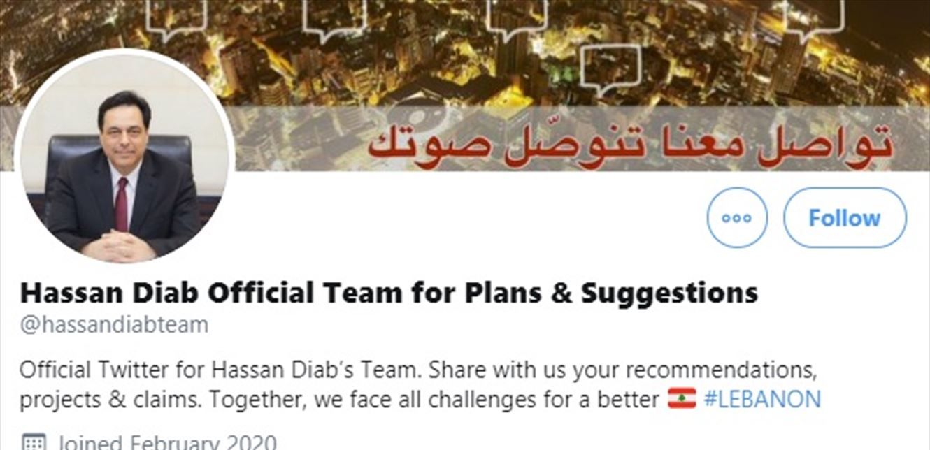 أطلق رئيس مجلس الوزراء الدكتور حسان دياب عبر "تويتر" حسابا للاستماع إلى اقتراحات اللبنانيين وآرائهم وأفكارهم، بهدف مواجهة التحديات وبناء لبنان أفضل، كما يطمح به الجميع. وحملت صفحة Hassan Diab Official Team for Plans & Suggestions شعار "تواصل معنا لنوصّل صوتك".