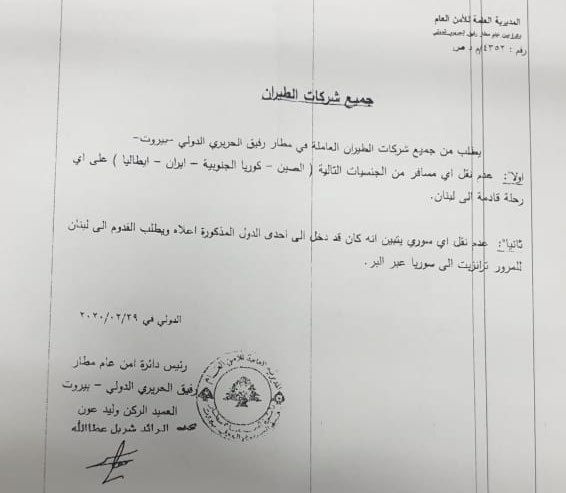 أصدرت المديرية العامة للأمن العام قرارًا منعت بموجبه شركات الطيران العاملة في مطار بيروت من نقل أي مسافر من الدول التي أصابها فيروس كورونا على أي رحلة قادمة الى لبنان. اشترك فى النشرة البريدية لتحصل على اهم الاخبار بمجرد نشرها تابعنا على مواقع التواصل الاجتماعى