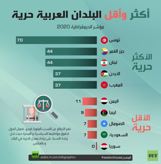 واحتلت تونس المرتبة الأولى عربيا بنسبة مئوية وصلت إلى 77% من حيث ضمانها للحقوق السياسية والمدنية لمواطنيها، في حين جاء كل من جزر القمر ولبنان في المرتبة الثانية بنسبة 44% بينما جاء كل من الأردن والمغرب في المرتبة الثالثة بنسبة وصلت إلى 37%.